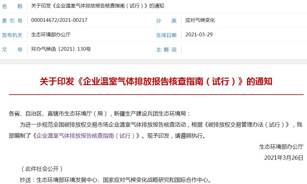 環保部發布《企業溫室氣體排放報告核查指南(試行)》