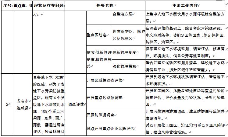 1.區(qū)域地下水環(huán)境狀況調(diào)查評估。在九市一區(qū)開展市級的地下水環(huán)境狀況調(diào)查評估,摸清區(qū)域地下水環(huán)境質(zhì)量狀況。 2.化工園區(qū)地下水環(huán)境狀況調(diào)查評估。以省級以上化工園區(qū)為重點,開展全省化工園區(qū)地下水環(huán)境狀況調(diào)查評估。 3.非化工類重點排污單位地下水環(huán)境狀況調(diào)查及監(jiān)測。開展危險廢物處置場、垃圾填埋場地下水環(huán)境狀況調(diào)查評估;開展上杭紫金山金銅礦等礦山開采區(qū)地下水環(huán)境狀況調(diào)查評估;地下水重點排污單位開展地下水環(huán)境狀況調(diào)查監(jiān)測。 |