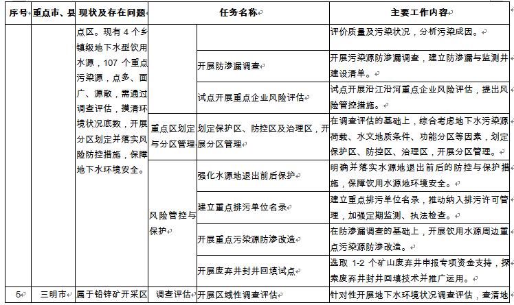 1.污染防治重點區(qū)劃定及分區(qū)管理試點。開展九市一區(qū)地下水污染防治重點區(qū)劃定工作。在龍巖新羅和連城、三明大田開展地下水環(huán)境分區(qū)管理試點。 2.重點污染源地下水污染風險管控與修復。實施重點污染源(化工園區(qū)、危險廢物處置場和生活垃圾填埋場等)地下水污染風險管控,以省級以上化工園區(qū)為重點開展地下水污染風險管控。開展漳州古雷港開發(fā)區(qū)重點企業(yè)地下水污染風險管控與修復試點。 3.礦山廢棄井封井回填。探索廢棄井封井回填技術,在三明市尤溪縣等礦山開采集中的區(qū)域開展廢棄井回填試點。 |
